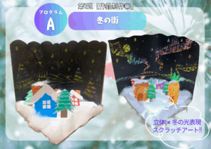 光(=きらめき)を表現しながら“街の物語”を作るアート。背景をスクラッチアートで作ることで、夜の街の冬景色を削って表現します。遠近感とレイヤーを意識した簡易ジオラマ形式です。