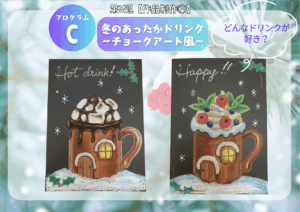 黒いクラフト紙をベースに、チョークアート風の技法で温かい冬のドリンクを表現します。色を重ねてふんわり感・温かみを出すことで、冬らしい雰囲気を演出