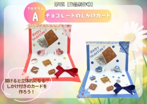 チョコレートデザインのカードを作ろう!合皮や紙粘土、アルミホイルを組み合わせて、開くと立体感のあるしかけ付きカードを作成します。色・形・奥行きを組み合わせ、見て触って楽しいアートカードです。