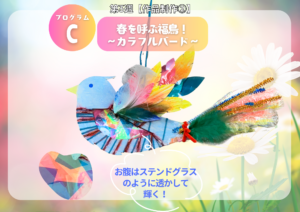厚紙や毛糸、本物の鳥の羽などを組み合わせて、カラフルな鳥のモビールをつくろう!お腹にはプラ板と透明ちよ紙を貼って光に透かしてキラキラ輝く仕様に!