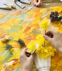 キャンバスを飛び出して、本物みたいなお花が咲き誇る! 絵の具でダイナミックに背景を描いたら、紙で手作りしたお花やアートフラワーを使って立体的にデコレーションしましょう。